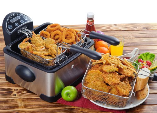 - Fry Fish And Chips At The Same Time. Our cool-touch, stainless steel Deep Fryer comes with 3 fry baskets--one jumbo for big batches of finger-lickin' fried chicken or donuts, plus 2 side-by-side baskets for smaller batches of fish-n-chips, fries-n-onion rings, or for frying foods with different cook times.